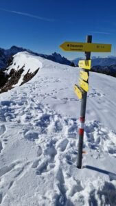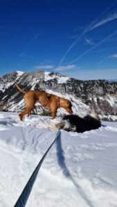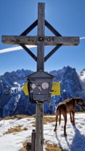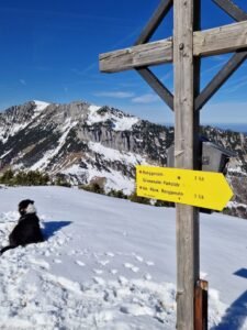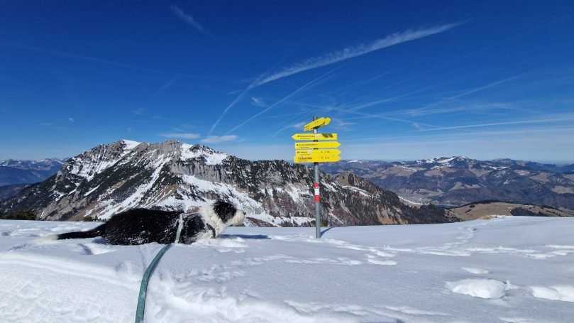 Nach rund 1,5 Stunden erreichten wir den Gipfel – und was für ein Ausblick! Das Kaisergebirge lag vor uns, und die Hunde genossen den Moment genauso wie ich. Djego legte sich gemütlich ins Gras, Ludwig beobachtete aufmerksam die Umgebung, und Mellow? Der lag einfach völlig zufrieden im Schnee, als hätte er genau darauf gewartet.